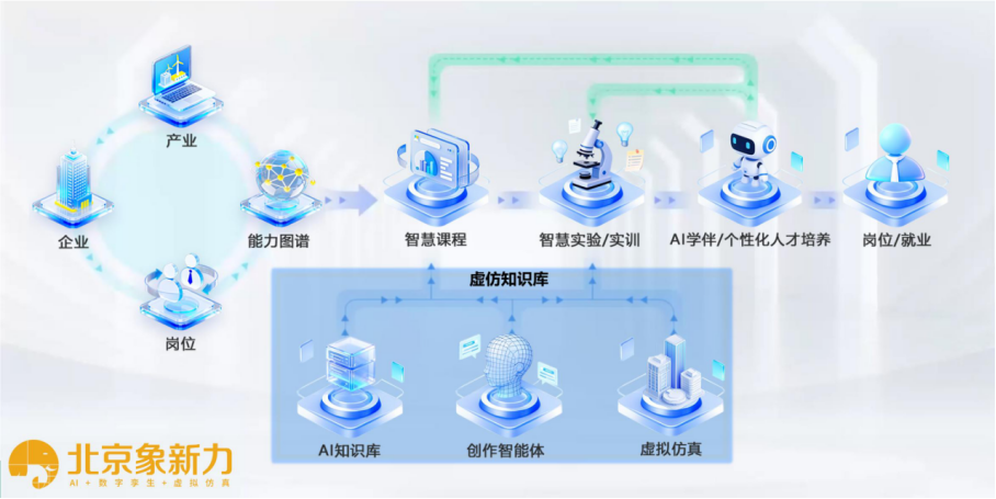 “象新力”路径的核心理念,可概括为:借助AI将实验实训深度融入课程,将人工智能与课堂教学全面结合,打造面向高校的智慧教学实训一体化平台。该路径并非简单地将技术叠加于传统教学之上,而是致力于通过AI重构“教、学、练、评”的全流程。