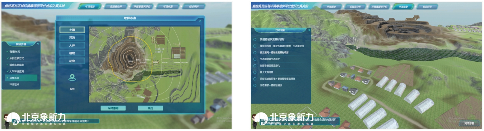 实验内容丰富多样。在环境调查环节,基于对矿山背景信息的学习,分析矿区污染物可能存在的迁移方式,对矿区环境(植被分布、大气)进行监测,并对土壤、河流、人体、植物、动物等进行布点并取样。实验室分析则是分析得到土壤、水、人体和动植物的监测数据,并开展小鼠急性毒性实验。环境毒理学评价采用单因子污染指数法分析土壤污染数据,评价矿山、大气、河流、农田土壤等的污染程度,并完成小鼠毒性实验毒物半数致死量的计算。环境修复方面,软件共设置 8 种技术创新,用户可针对当前环境状况,选择合适的技术创新修复方法,完成对当前环境污染的修复。综合评价是对遥感监测、空气监测、重金属测定数据及图像进行前后对比观察,并根据检测前后结果,完成对修复后区域环境的评价。