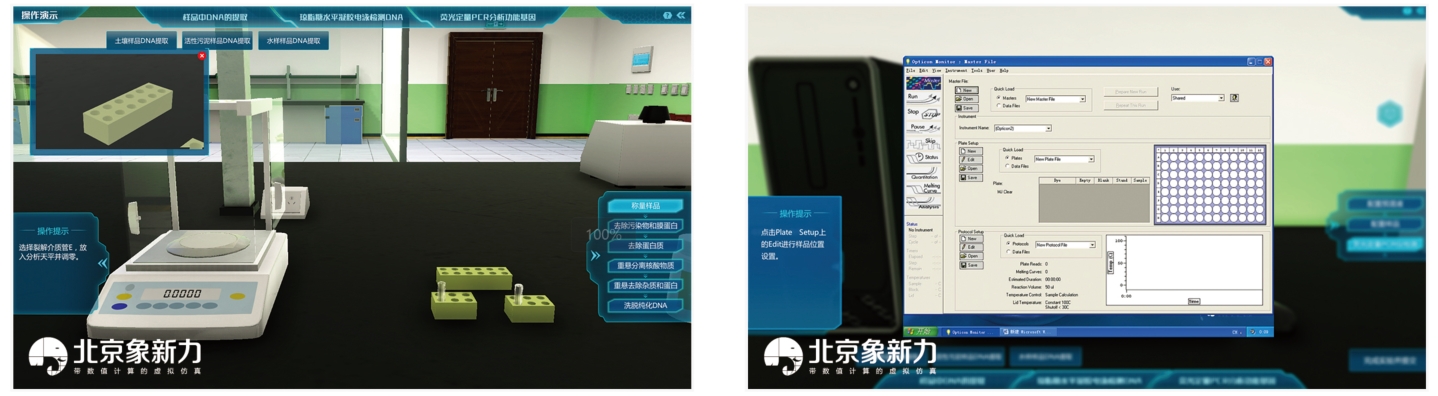 此软件模拟真实的实验室环境,摆放了常见的设备仪器和试剂,构建了一个沉浸式的实验室环境场景。其中包括三维实验室场景、恒温水浴锅、高速冷冻离心机、移液枪、枪头、离心管、96 孔 PCR 反应板、冰箱、制冰机、涡旋仪、电泳仪、电泳槽、凝胶成像系统、荧光定量 PCR 仪等。在荧光定量 PCR 检测实验中,了解这些仪器的原理和使用方法是非常重要的,而该软件为学生提供了一个直观的学习平台。