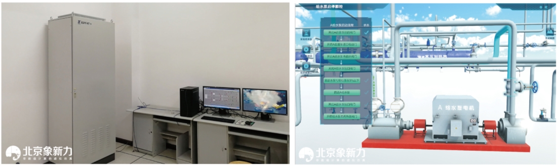 该系统具有广泛的扩展性和后续开发功能,可以扩充不同的实验对象数学模型和控制模型。这为探索热工自动控制中的数字孪生创新提供了可能,也符合数字孪生在热工自动控制中的优势体现。其次,采用最小化 DCS 系统,对项目中采用的控制系统软硬件,运用最小化 DCS 的方案。真实的 DCS 软硬件采用国电智深主流工业产品,易于升级,使用方便。系统可以进行控制组态与调试、运行监视,是一个小型化的监控系统,支持火电过程控制的算法与方案,包括联锁、顺控、模拟量控制。再者,系统实现了虚实结合,真实控制系统软硬件与虚拟实验对象结合构成半实物仿真。学生在编程环境中编制控制逻辑,然后下装到硬件中运行,与三维软件系统之间进行通讯,控制虚拟环境下的热工设备的运行,组成半实物仿真系统,这也是热工自动控制数字孪生技术应用的重要体现。另外,系统采用一机双屏设计,一个屏幕查看 DCS 控制系统,搭建 SAMA 图,调节参数;另一个屏幕查看三维场景中控制对象的动画变化,极大地提升了实验的直观性和便捷性。