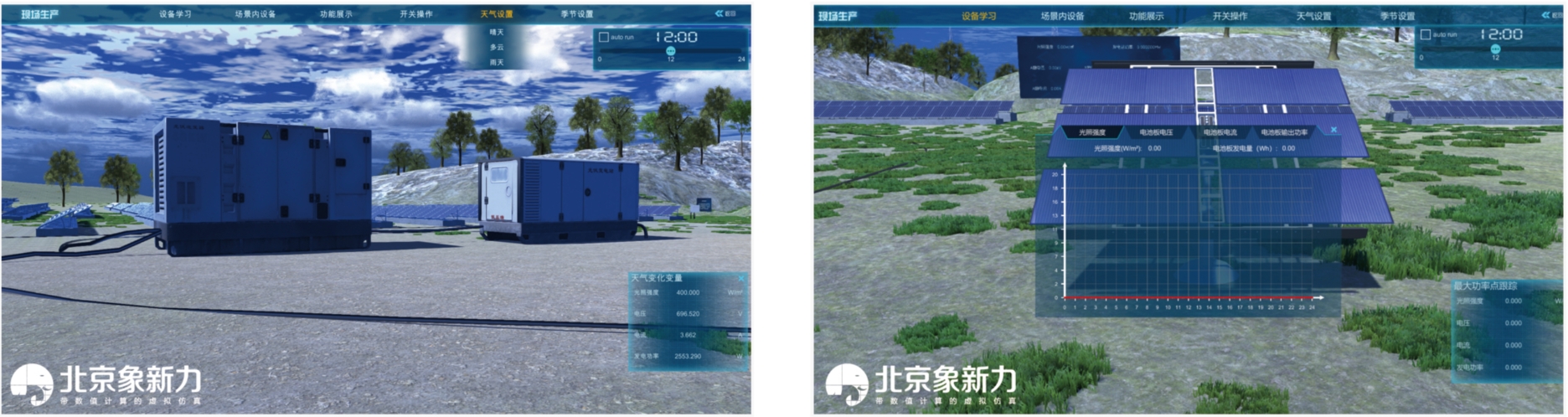 本软件主要用于光伏发电系统学习,让用户在不去现场的情况下,就对光伏电站的操作运行、设备功能、相关实验有深入了解。对于相关工作人员或者学生的自主学习来说,通过相关的操作学习就可以了解光伏电站操作运行的相关知识,为培育相关的光伏电站的工作人员做准备。它还适用于培训员工,成功地将一些光伏电站难以展现的实体场景复原,加强员工对光伏电站的了解。该仿真平台支撑系统全面支持从底层数学模型到二维人机界面、三维人机界面的开发,配以自动评价系统和 web 仿真和题库资源管理系统,可以支持电力系统、热力系统、化学化工、环境工程、食品、生物等多种专业的仿真资源的开发和应用,满足了光伏发电系统虚拟仿真实验关键技术的需求。