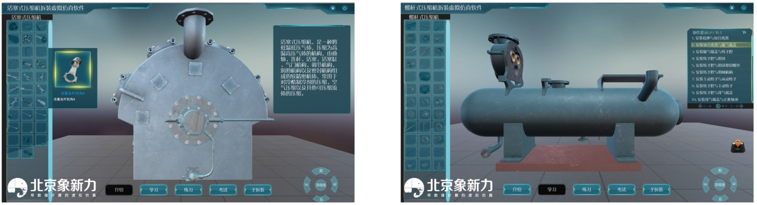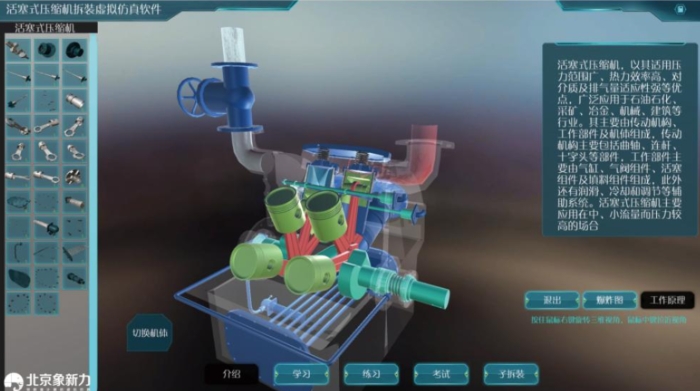 软件可以进行相关的培训、学生教学等。使培训人员和学生轻松掌握相关知识,避免只有去现场才能进行培训、才能进行学习的不便因素,具有较强的实用性。对于适合初学者的压缩机拆装虚仿实验以及专业压缩机拆装虚仿实验课程都能提供有力的支持。