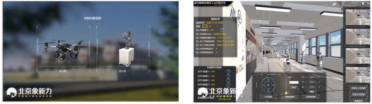 本项目以三维虚拟现实技术、数字孪生技术为基础,以大型客机 (C919) 故障检测数字孪生系统为仿真对象,提供场景和主要系统、设备的三维模型及各个系统的连接关系。场景中包含国产大型客机,可操控的无人机,无人车,满足无人机、无人车的故障检测要求。在无人机 / 无人车控制模拟、巡检过程中,虚拟系统实时获取无人机 / 无人车位置信息、状态数据信息及巡检信息。实验过程为虚拟结合控制模式,分为正向和逆向控制两种方式。正向模式下,实验人员操控现场无人机 / 无人车,同时将无人机 / 无人车速度、位置、时间、状态、相机拍摄信息等信息发送给系统,在虚拟场景内展现出对应的巡检信息,虚拟场景中无人机 / 无人车跟随运动,实时显示相应的状态信息;逆向模式下,由软件发送控制信息,遥控现实无人机 / 无人车运动,实现虚实结合的映射。