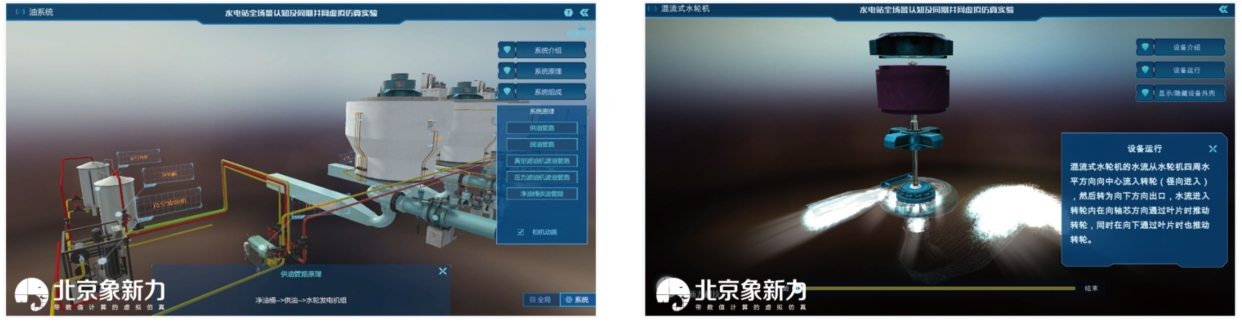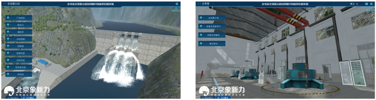 以真实水电站设备为对象,将环境放置到真实场景中。学生可以通过 3D 画面鸟瞰整个水电站的场景,如同身临其境;还能在水电站中漫游,通过飞行模式到达各个地方,观察学习水电站的整体布局和系统,为水电站全场景认知研究提供了有力支持。