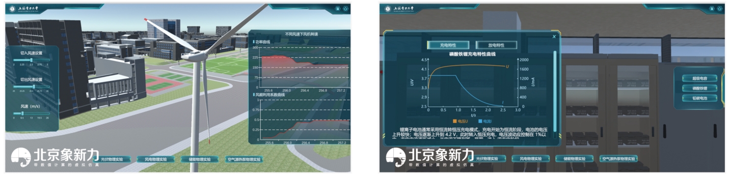 可以进行风力发电系统搭建,可以设置切入风速、切除风速、风速。场景中的风机转动速度会随着风速的变化而变化。修改切入风速、切除风速、风速,查看风机的功率、风能利用系数曲线。这对于校园能量收集设备的最佳实践具有指导意义,体现了绿色校园能量的多元化应用。