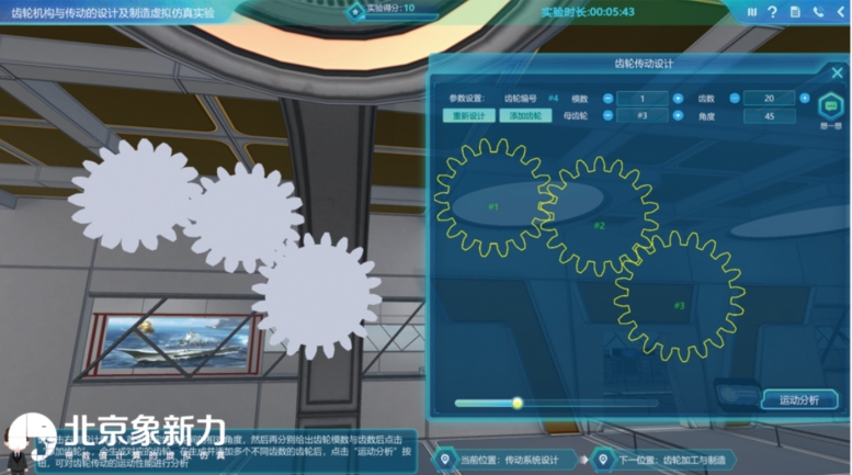 该软件实验设定了包含齿轮机构学习、应用介绍、机构分析、传动系统设计、加工制造、测量检测、分析、验证等多个环节。在齿轮传动系统设计方面,学生可以运用齿轮传动系统优化设计方法,通过齿轮传动设计的计算与仿真,由被动学习变为主动探索。实验充分利用了虚拟仿真实验的 “虚拟” 特点,具有可视性、可说性及可测性,激发学生的研究兴趣和创新能力。内容设计上按照由简单到复杂,由基础学习到系统设计验证的原则,学生上手容易,操作方便,学习效率高。在此基础上,设置了综合评价分析等环节,引导学生主动去分析、理解各个知识点之间的复杂关联关系。通过知识交互式学习、方案自主设计、仿真运行验证和综合分析反馈等环节,实现以学生为中心的自主探究式学习,就像在齿轮机构虚拟实验教学案例中所展示的那样。