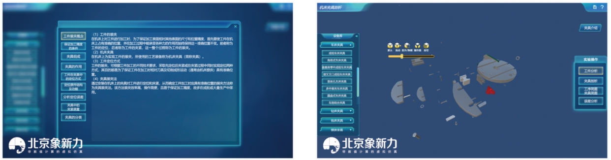 软件以基础知识学习为基础,帮助学生了解巩固夹具相关知识。学生可以通过模型自主拖动、显示隐藏以及爆炸图及剖切等方式,满足自主学习的需求。通过夹具剖析、工序简图和夹具简图绘制及误差分析,进行夹具自主认知和分析。软件还提供了机床夹具拆装步骤详解,以图示的形式展示拆装流程,让学生能够更清晰地掌握操作要点。