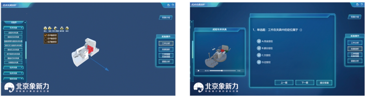 软件根据实训室常用的车床夹具、钻床夹具、铣床夹具、镗床夹具、磨床夹具以及拉刀夹具建模,完全还原实验室各类复杂夹具。它解决了现场实训夹具台套数及拆装工具不足和夹具工具维修保养繁琐等问题。在实际教学中,学生可以通过软件进行大量的拆装练习,掌握拆装机床夹具的最佳实践,而无需担心工具和设备的限制。同时,这也有助于提升机床夹具性能,为机床夹具结构优化提供了可能。