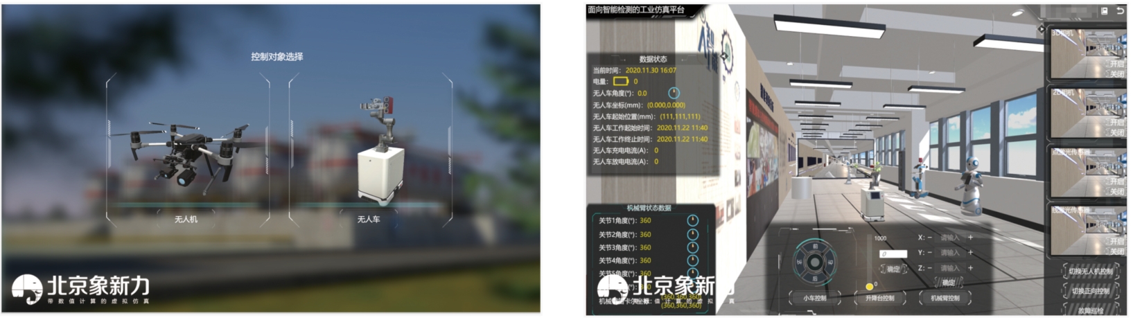 在无人机 / 无人车控制模拟、巡检过程中,虚拟系统实时获取无人机 / 无人车位置信息、状态数据信息及巡检信息。实验过程为虚拟结合控制模式,分为正向和逆向控制两种方式。正向模式下,实验人员操控现场无人机 / 无人车,同时将无人机 / 无人车速度、位置、时间、状态、相机拍摄信息等信息发送给系统,在虚拟场景内展现出对应的巡检信息,虚拟场景中无人机 / 无人车跟随运动,实时显示相应的状态信息;逆向模式下,由软件发送控制信息,遥控现实无人机 / 无人车运动,实现虚实结合的映射。这种虚实结合的控制方式,充分体现了工业虚仿平台的数字孪生架构的优势,为工业检测流程的优化提供了有力保障。