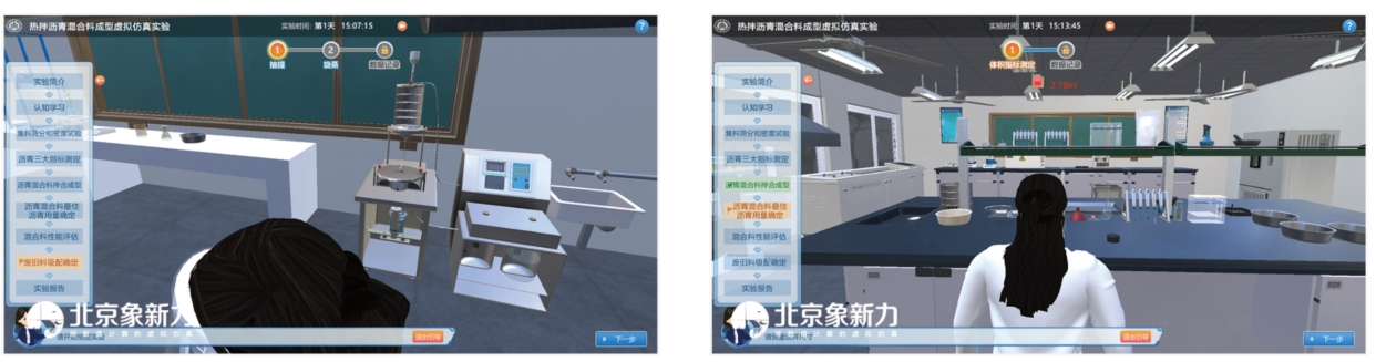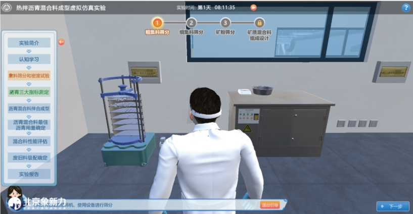本实验设计遵循循序渐进的原则,这与热拌沥青混合料配比设计原则相契合。在步骤上,先进行集料筛分实验,这一环节涉及热拌沥青混合料的材料选择。通过集料筛分实验来进行混合料组成设计,根据设计结果完成沥青混合料成型实验,最后进行试样的体积指标测定和性能评估。在虚拟仿真试验中,分解为实验认知、实验引导、实验操作考核和结果计算等教学模块,支持二维页面互动和三维场景互动,让使用者掌握基础知识与原理,学习集料筛分 - 组成设计 - 性能评估 - 结果计算的实验流程和操作。