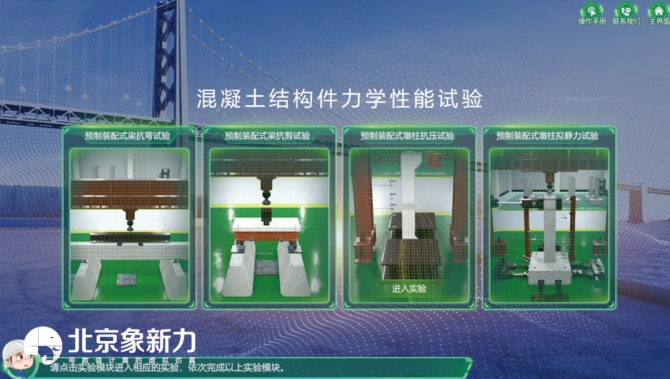 在传统的实验教学过程中,全预制装配式桥梁力学性能测试成本耗费巨大,试验周期长,还存在一定的危险性;施工工艺往往只能通过老师的讲解和视频学习,很难进行完整的试验过程。而开发设计的此全预制装配式桥梁力学性能与施工工艺虚拟仿真试验系统,为教学带来了全新的体验。学生通过该实验的学习,能够掌握预制装配式梁抗弯试验、预制装配式梁抗剪试验、预制装配式墩柱抗压试验、预制装配式墩柱拟静力试验,以及全预制装配式桥梁构件上部结构制备全过程、下部结构制备全过程、上部结构的安装、下部结构的安装。全预制装配式桥梁力学性能分析在这个实验系统中得到了充分的体现,学生可以通过交互性实验步骤操作以及参数设定等步骤,加深对全预制桥梁的力学性能特点的认知和理解,丰富学生的想象力,提升实验教学效率。同时,对于装配式桥梁施工工艺流程也有了更直观的认识。