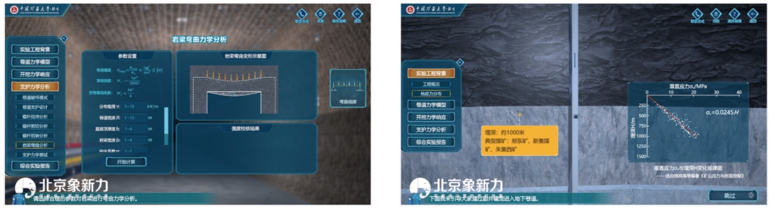力学模型是根据研究对象的关键力学特征高度抽象得到的。巷道开挖围岩稳定性及支护中隐藏着简支梁、悬臂梁、架结构、框架结构等力学元素。本软件严格遵循巷道开挖力学分析方法,创建地下围岩所处的地应力环境,充分体现地下工程区别于地上工程的力学特征。学生在虚拟环境的沉浸式场景下,不仅能直观感受巷道开挖的现场工作环境,感受围岩和支护结构的力学响应规律,还能从创设的虚拟环境中发现和体验力学建模的奥妙,将理论联系实践,理解和掌握复杂地下工程中的力学分析方法。在三维动态仿真环境下,学生可以通过改变围岩物性、巷道位置、开挖方案、巷道形状和尺寸等,学习不同条件下围岩工程力学响应规律,体会各种因素对围岩力学响应的影响特征。