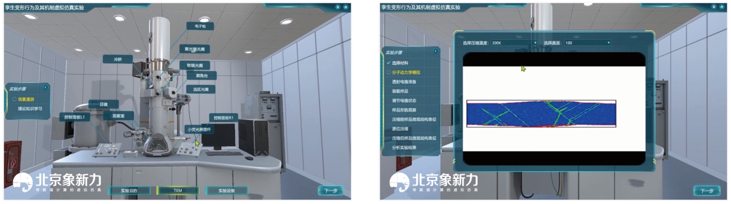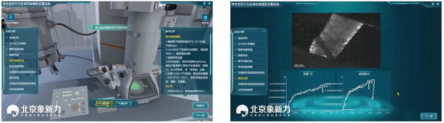 本虚拟仿真实验软件旨在通过纳米单晶样品在孪生位向原位压缩的虚拟仿真实验、结合孪生变形的分子动力学模拟计算,使学生在实验操作上能够掌握聚焦离子束加工制备样品、透射电镜下开展原位压缩实验、透射电镜下原位观察变形过程。从孪生变形行为的理论与实验结合角度出发,让学生在理论上能够通过分子动力学模拟结果,分析对比并理解孪生变形的发生条件与分位错滑移机制,从理论和实验两个方面深入理解孪生变形行为及其机制。该软件还涉及到孪生变形行为实验研究方法以及孪生变形行为的数值模拟方法等内容,为学生提供了全面的学习体验。