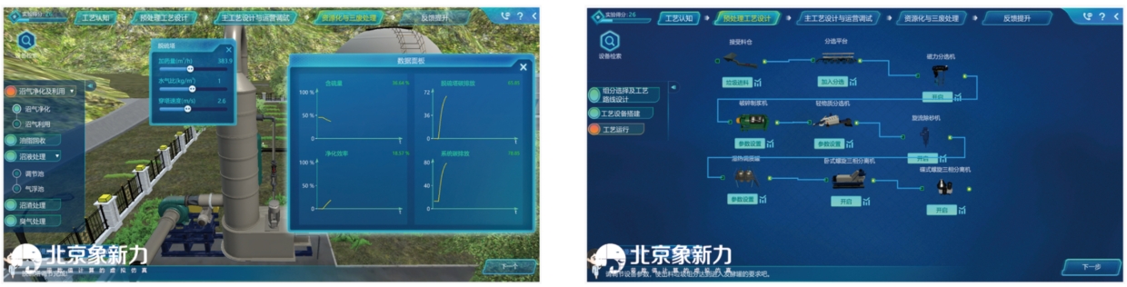 此软件依据基础入门(工艺认知)、工程进阶(设计调试)和高阶创新(反馈提升)的学习层次进行设计。它以先进的易腐垃圾生物质处理中心为原型,构建了垃圾分选、厌氧发酵、油脂回收、沼气资源化、沼液处理、沼渣处理、生物除臭等工艺过程中包含的设备。用户能够自行选择垃圾组分、设计预处理工艺路线、搭建运行预处理工艺设备、设计厌氧发酵主体工艺、完成三废处理及资源化等操作。这有助于提高学生解决复杂工程问题及综合研究科研创新能力,同时也体现了易腐垃圾厌氧消化技术优势,让学生深入了解该技术在实际应用中的价值。