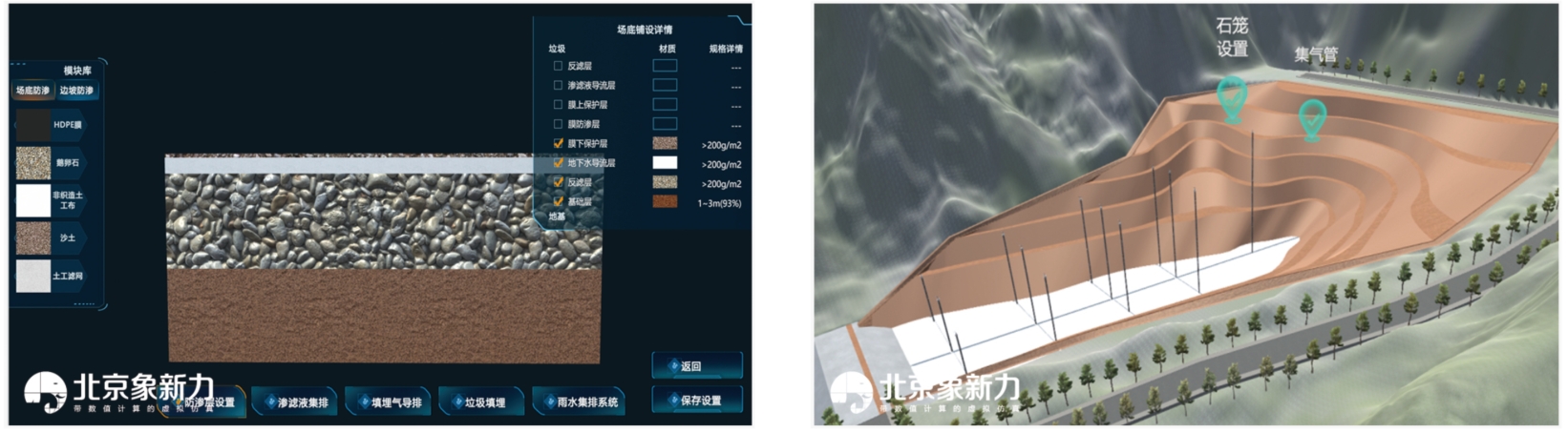 仿真系统以大型垃圾填埋场为原型构建,其中重点体现防渗层设置、渗滤液集排、填埋气导排、垃圾填埋过程、雨水集排系统包含的设备。这为用户了解如何进行垃圾填埋实验提供了直观的模型,让用户清晰看到实验中各个关键环节的设备和操作。
