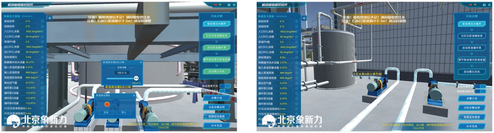 用户可以在三维场景中对脱硫系统的设备、阀门进行任意操作,软件不固定于既定操作流程。对于用户不符合规程的设备操作方式,软件不会出现报错、强制退出、卡死等情况,而是在数据和现象上出现相应的结果及反应。这为改善烟气脱硫系统实验效果提供了更多的可能性,学生可以大胆尝试不同的操作方式,探索最佳的实验方法。