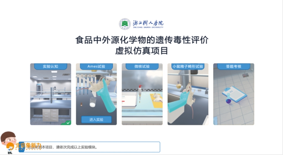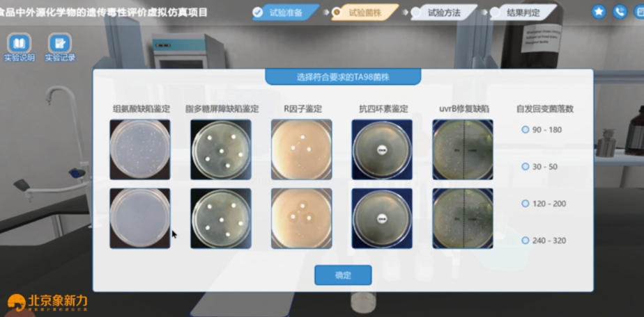 2. 三维动画展示实验过程:软件以三维动画展示实验过程,用户在场景中可以通过动画直观感受遗传毒性实验操作过程,通过三维交互了解重要步骤的操作流程。这种直观的展示方式,让学生能够更清晰地理解如何评估食品中外源化学物的致突变性等关键问题。