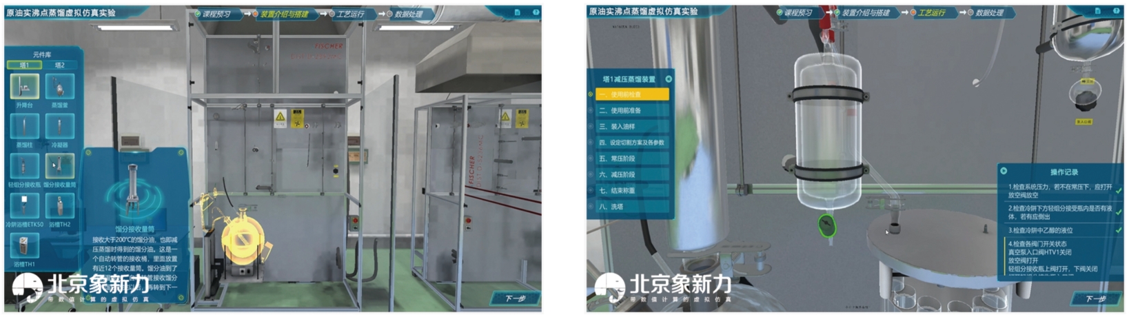 3. 逼真的实验场景模拟:模拟了真实的实验场景,用户可以在虚拟平台的实验室三维场景中漫游,搭建实验设备,以任意角度查看实验设备,观察实验现象。这有助于学生更好地理解原油实沸点蒸馏实验步骤详解,同时也能让学生提前了解实验室原油蒸馏设备的外观和操作方式。