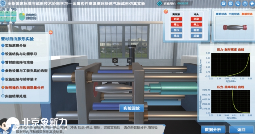 本实验围绕金属构件高温高压快速气胀成形这一先进制造方法展开。采用管材自由胀形实验与超高温快速气胀实验相结合的双环节教学模式,让学生在掌握一定管材塑性成形知识及国家标准测试方法的基础上,深入了解材料胀形性能。通过该软件,学生能够进入高度映射实际工况的复杂构件制造场景,完成原理认知、设备选型、工艺设计、成形操作等多环节实践学习。在这个过程中,金属构件高温气胀成形技术得到了充分的体现,学生可以直观地感受到高温高压条件下金属变形行为的特点。