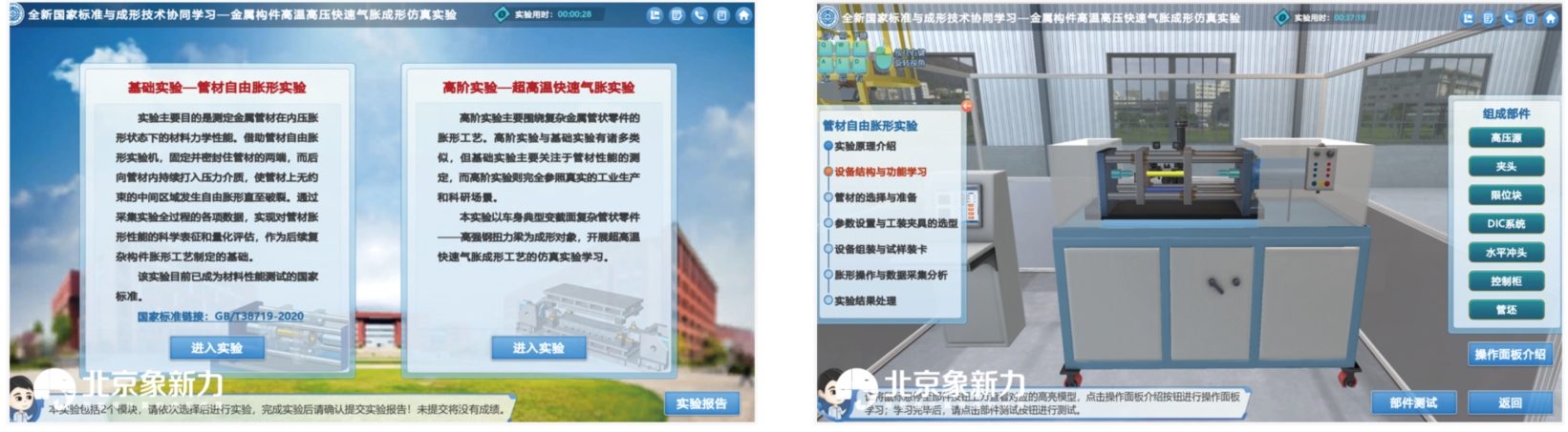 · 管材自由胀形国家标准相关:包括 GB/T38719 - 2020 管材自由胀形国家标准的理论知识与测试原理,以及管材自由胀形国家标准实验操作与分析方法。通过这些内容,学生可以深入了解金属构件成形过程中气体的作用以及气胀成形中金属的热处理效果。