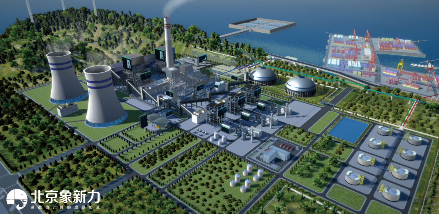 本项目充分运用三维虚拟现实技术,以背山面海的地理场景精心搭建未来能源工厂的三维虚拟模型。能源工厂生产的电、天然气、热、水通过管网送往远处的一个虚拟城市(远景),海面还有 LNG 船及煤炭运输船,营造出逼真的能源生产与输送场景。在综合能源实验中使用的计算模型和仿真技术的支持下,该软件在仿真运行管理后台和仿真机里模型软件的配合下,提供从场景到内部结构,操作到实时数据的一体化教学仿真解决方案。同时将设备的结构原理等知识点巧妙地穿插到本软件中,用户可以一边操作,一边看到现象,同时学习相关的原理。本系统知识点展现环节重点包括实时燃料消耗、输出功率、发电效率、污染物排放指标、碳排放指标等,这也体现了综合能源实验对环境保护的影响,有助于推动绿色经济的发展。