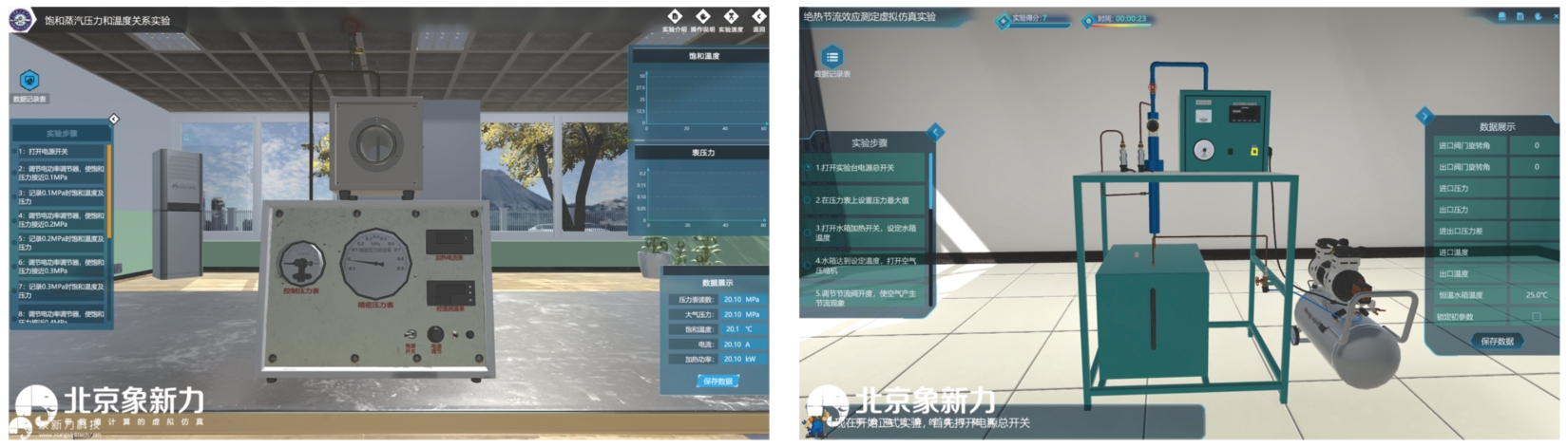 实验设备、实验器材、测量表计等装置均与实际实验室相符。泵、阀门、喷管、管道的外观与真实设备一致。设备运行时伴随有设备转动、震动、指示灯开启等现象与现实一致。实验中对设备的操作也与真实操作相一致。学生可以通过在线工程热力学虚拟仿真实验,如同置身于真实的实验室中,感受工程热力学实验的魅力。