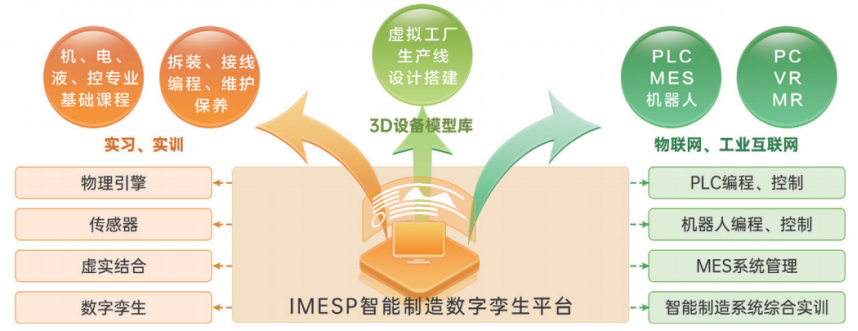 IMESP平台是一个具备3D设备模型库,可进行虚拟工厂生产线设计搭建,面向机、电、液、控 专业、基础课程,提供拆装、接线、编程等实训内容的智能制造数字孪生平台。